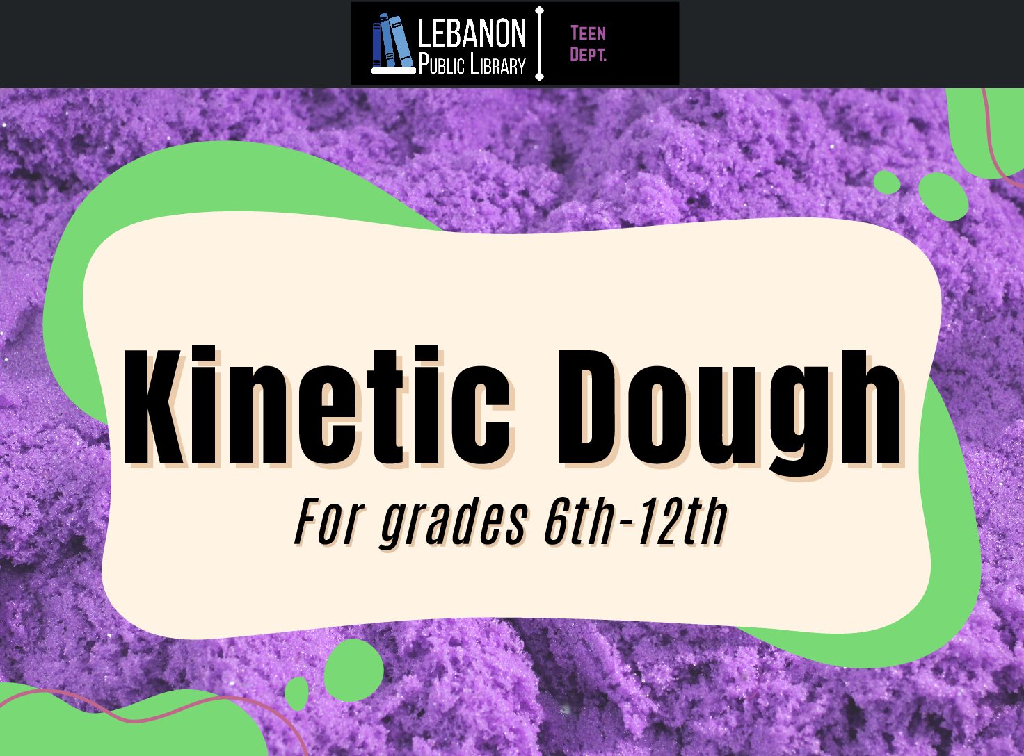 Teen SpaceJoin us in making your own kinetic dough! For grades 6th-12th.