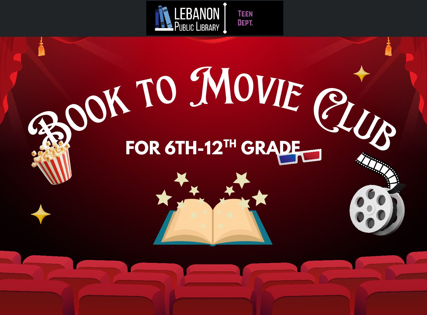 Book to Movie Club is back! Read our selected book of the month and join us for a book discussion and to watch the movie! Snacks are provided. For Grades 6th-12th.